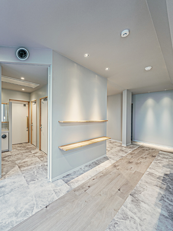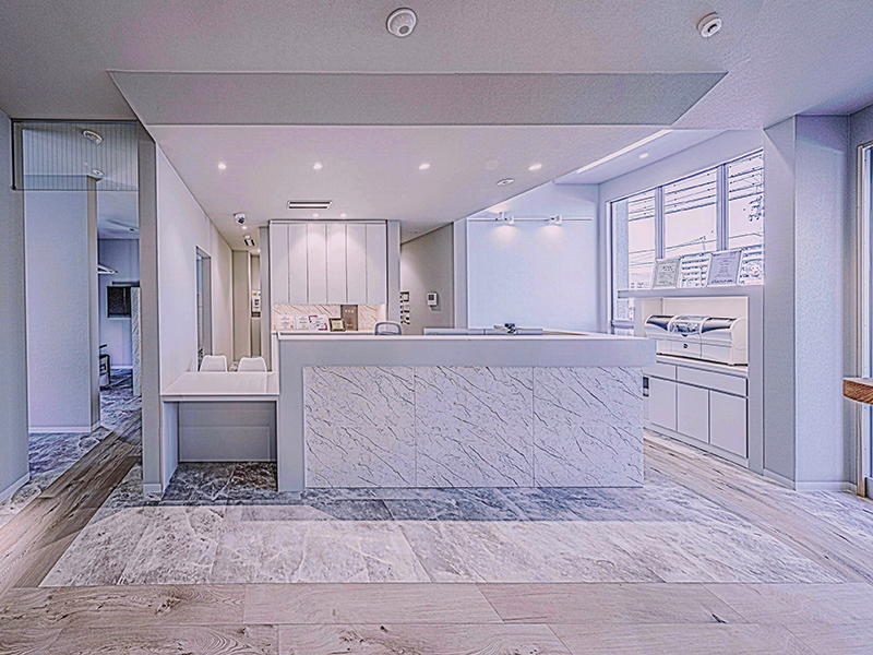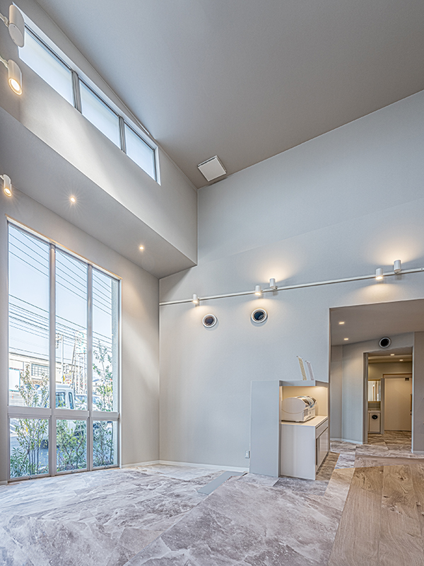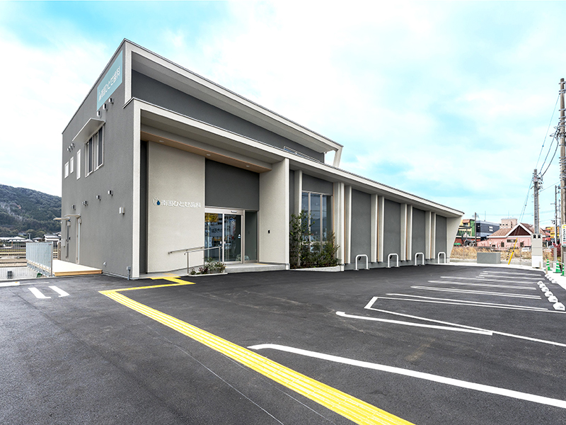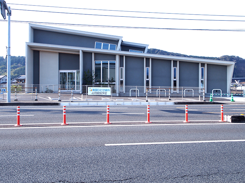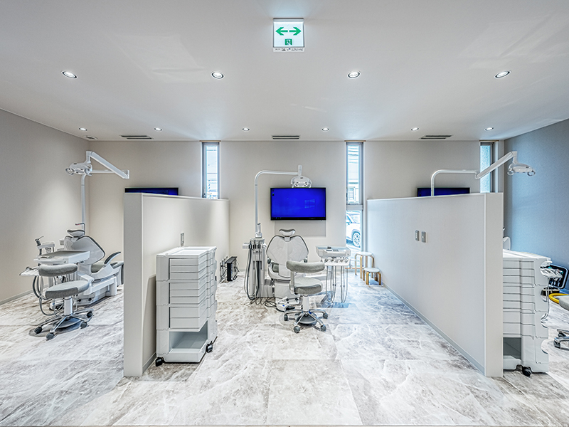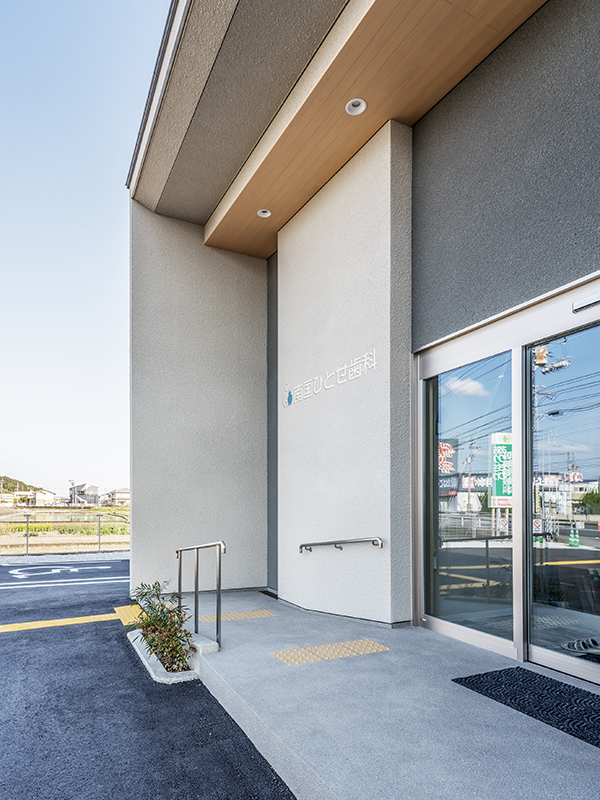 南国市に建つこの建物は、在来軸組工法2階建てで歯科医院としては少し大きめです、業務構成として治療に加え予防も組み込んでおり今までの歯科医院より広いスペースが必要でした。待合も治療と予防に分けてスタッフ業務エリアを中心に左右で治療及び予防エリアと分割して、各エリアを境界部分に構造フレームを配置している。表面には概ね木材を表しにしていないが、棚、天井の一部、階段は木材を表しとている又、個室ブースによりキッズ対応とするほか授乳室も設け赤ちゃんを連れて治療に来られる方にも対応していて、建物2階部分はスタッフエリアとし会議室、更衣室、スタッフルームと託児スペースも備えて、働き易い環境を整えている。構造を木造にする事で柱や梁型が邪魔にならず、工期やコストも抑えられている。