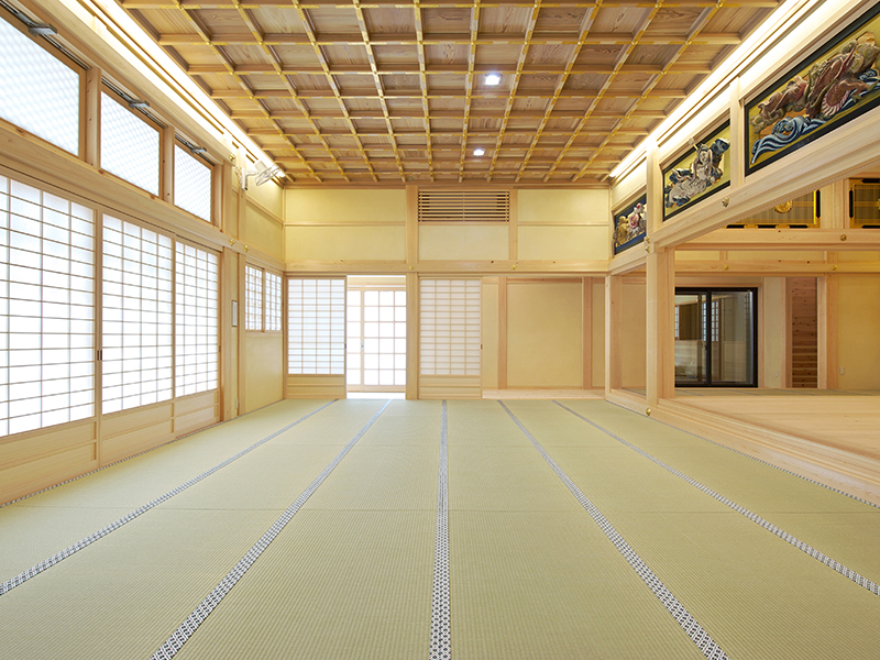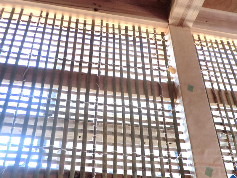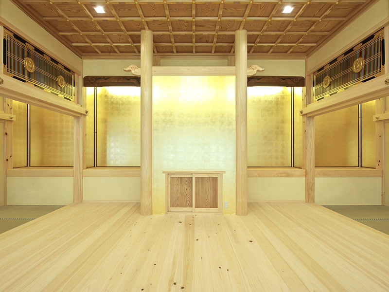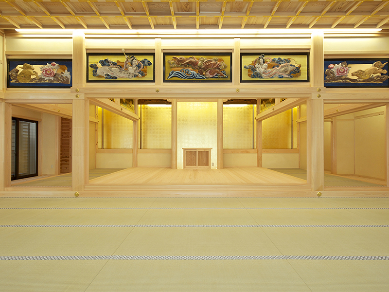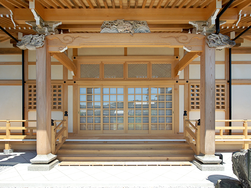 一部木材は寄進により構造材及び仕上げ材として使用し、既存寺院より虹梁、木鼻、蛙又、縣魚などの部材を再利用しています。