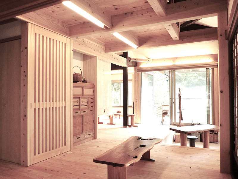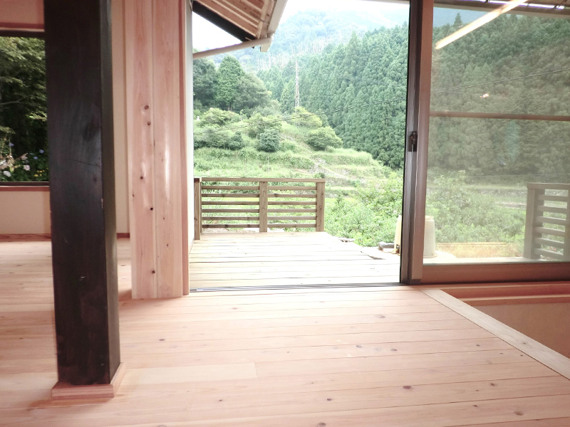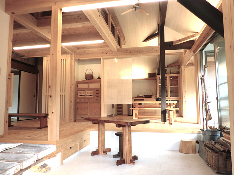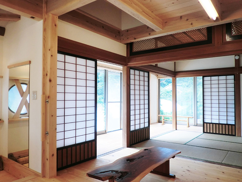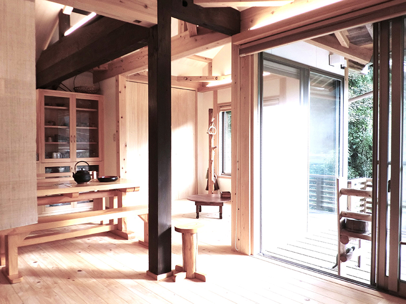 海岸沿いの国道より山手に30分入った所に大正時代に建築された美しい和風建築があり、その建物をリノベーションの計画に入った。90年の経過は趣があり、その当時の生活様式を感じさせたが、その歳月は想像以上に劣化を招いていて、基礎を始め柱や外壁、屋根まで補強や補修が想定された。クライアントの意向は、この建物を次の世代に残したい又、現代風な計画とし機能的で快適な暮らしが出来るようにしたいなどの要望があり、中でも薪ストーブへのこだわりがあり、いくつかの機種から選定した。敷地は南東に開け景観もとても良い土地ですが、建物は南東側に収納など配置していた為、収納や壁を取り払い広い掃き出し窓を設置し、強度不足を防ぐ為一部増築を加えバランスよく補強する事により、次の世代に繋げられる様になった。南東開口部にウッドデッキを加え機能的に暮らせる様計画し、屋根裏スペースを小屋裏収納に利用する要望もあった為、可能な範囲で設けた。リノベーションの際、地域景観に配慮した建物となる様計画出来、施主や地域の方々にも喜ばれている。
