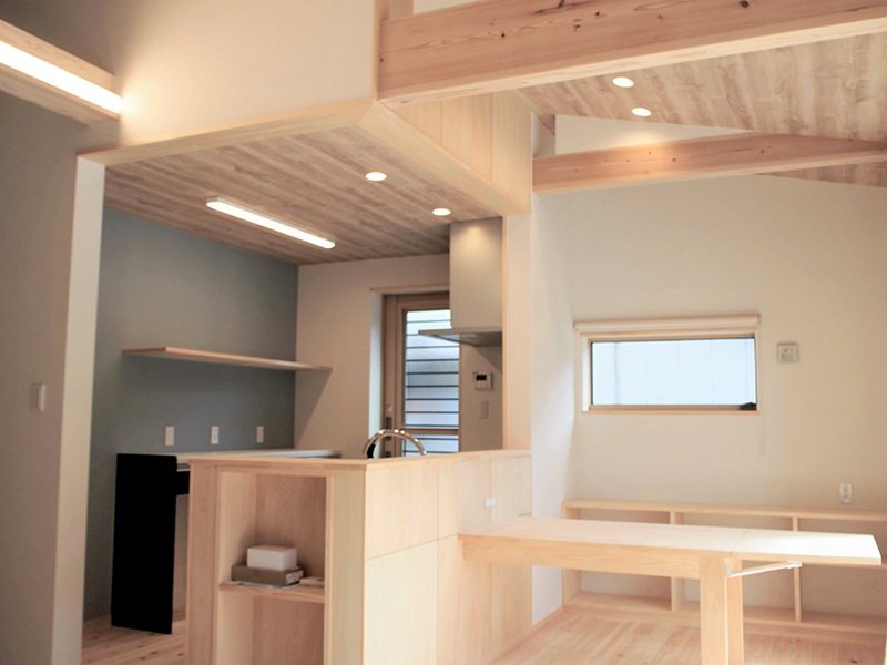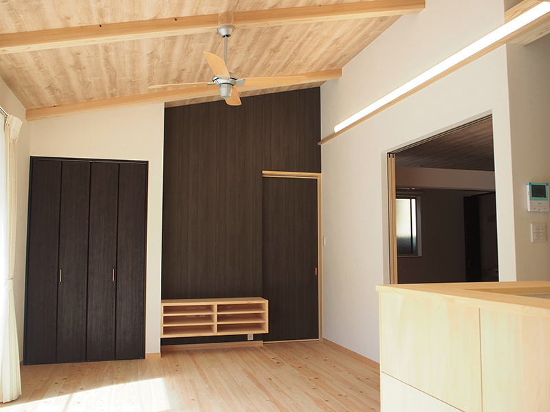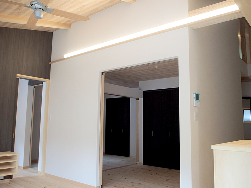 長者川沿いに子育てを終えた夫婦の住宅として愛着のある土地に住み続ける思いを新築と言う形にした。道路より一段上がった土地は見晴らしがよく開放感が有る又、友人が良く集まる為、バルコニーとリビングを繋げ、子供たちが帰省の際宿泊する部屋も設け、リビングと繋げた。普段は引き戸を開放して使用しているので広々とした空間を得られた。玄関ホールから回遊動線により各部屋に短い動線で行ける計画とし、安全対策としては地盤強度が強く平屋建てと言う事もあり安全性は高い又、この地域は積雪の考慮が必要で、基準による積雪を見込んで設計した。