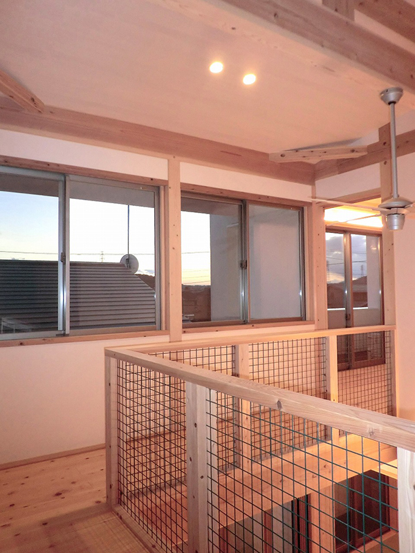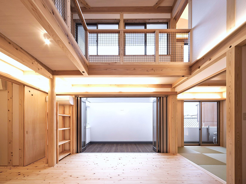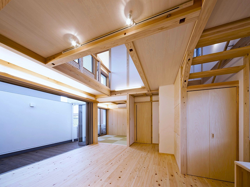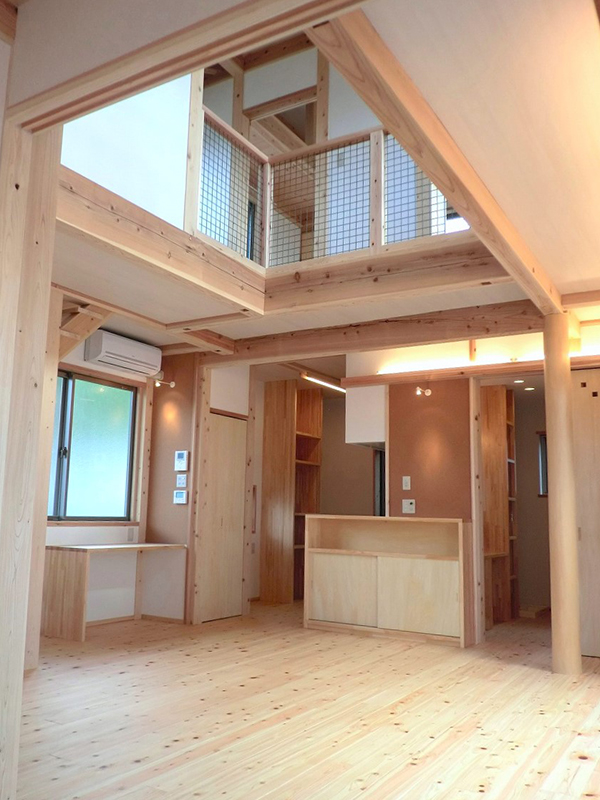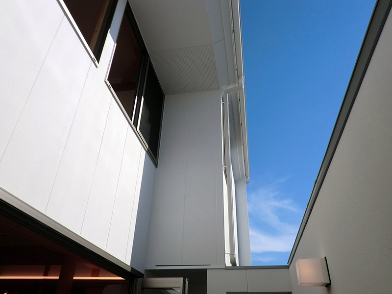 高知市の久万川添いの奥まった土地は旗竿敷地の為工夫が必要であった又、豪雨災害の危険性もある事から入念に検討した。計画案は3階建てで、1階部分を駐車スペースとし2.3階を居住スペースとした。2階リビングは南向きであるがバルコニー壁を3階まで立ち上げ向かい側の家からの視線を消した。敷地の条件により南東位置は浴室として視線を消し水回り動線を集約している。リビングは南バルコニーと一体で使える様全開放の折れ戸とし、天候の良い日は折れ戸を開放し部屋として使用出来、外壁をスクリーンとして映像も投影出来る様にしている。リビング上部の吹き抜けは、3階から入った直射日光を取り入れリビング全体を明るくし、3階から入った風は、2階バルコニーへと流れる。敷地は悪条件であるが、工夫により機能的で快適な建物となった。