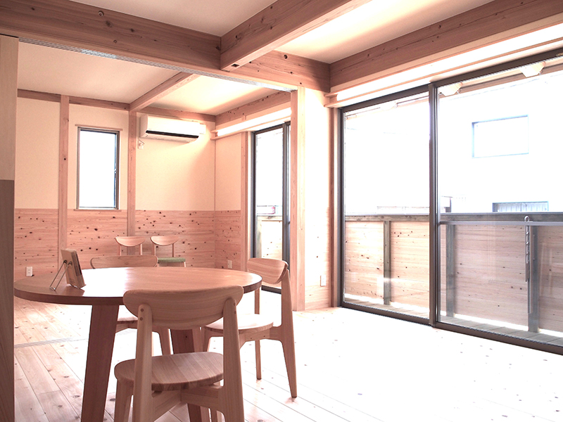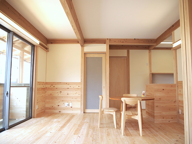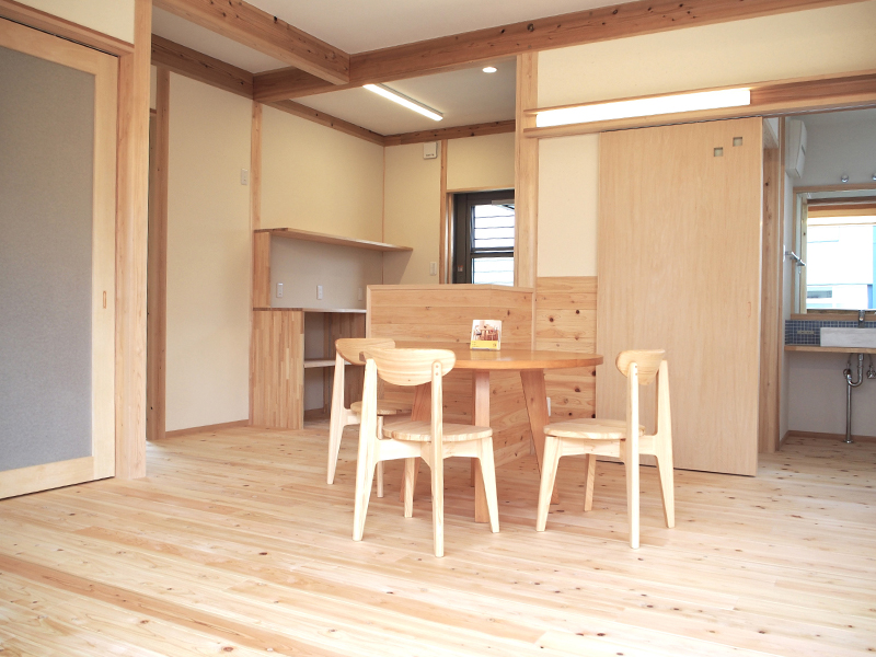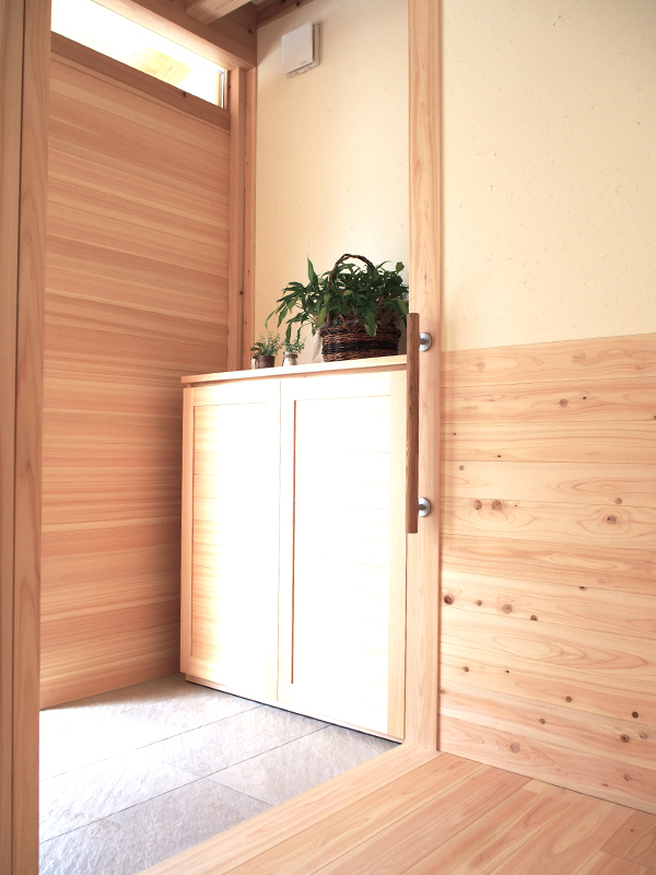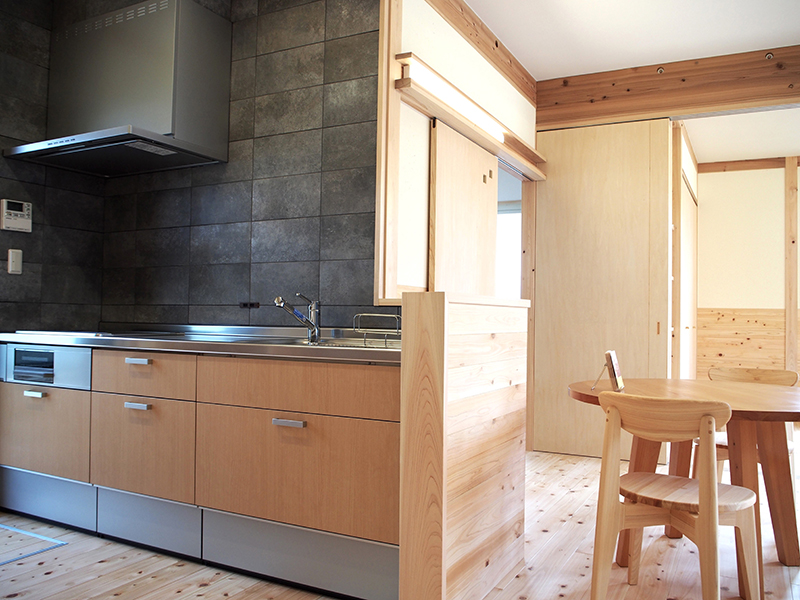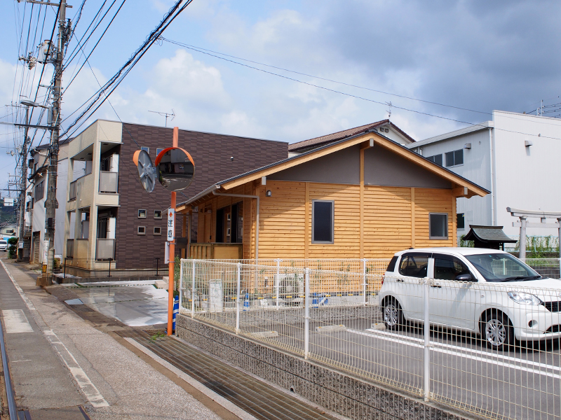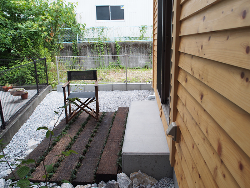 高知市西部の電車通り沿いに建つ平屋建て住宅は、古い町並みが残る密集した地形に有る。南側の通りは電停前の人通りが多く、視線を和らげる為駐車スペースと建物の間に植え込みを設けその手前にウッドデッキも設けた。ファサードは桧板の表しとし、切妻屋根の落ち着いた外観とした。施主の希望はコンパクトな住まい約18坪とし、玄関ホールは段差を少なくするユニバーサルデザインとした。ホールよりリビングに入ると南側の窓より採光と通風が部屋全体に広がり開放感がある。キッチンはダイニングより少し奥まった所にあり、玄関ホールからは視角となり見通せない。東側寝室はリビングと連続して使える様全開口出来る建具で間仕切られているが、通常は開放して使用する。反転方向にある西側寝室は主寝室とし道路より距離を取り、あえて南側に納戸を設け騒音のクッション層としている為、静寂が保たれている。西側寝室の窓からコーナー庭園に続くこの庭園をテラスとして、くつろぎの空間である三角形の庭園を有効活用する事とした。