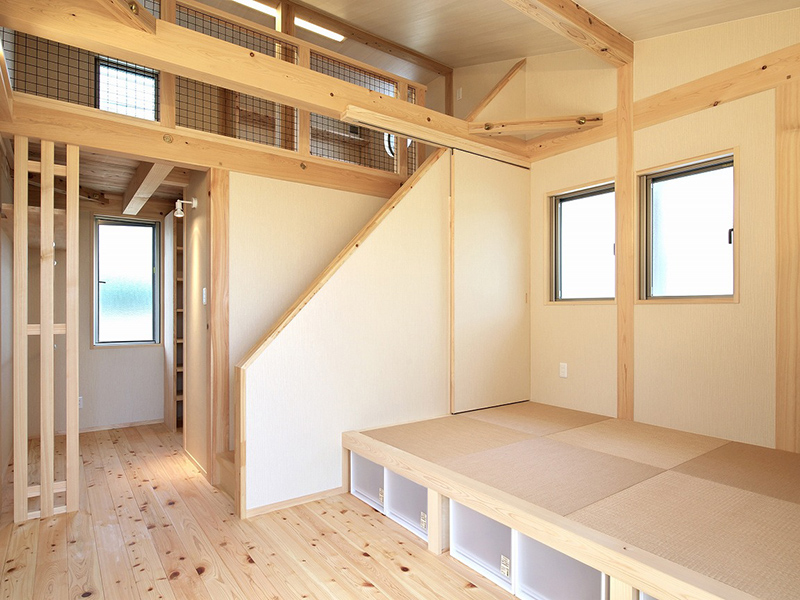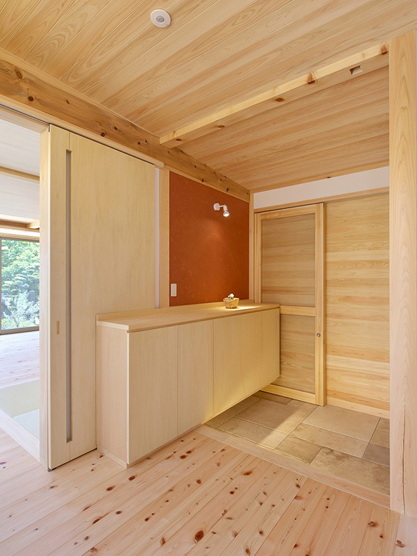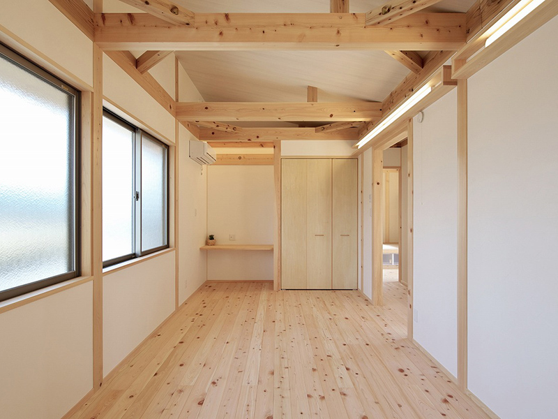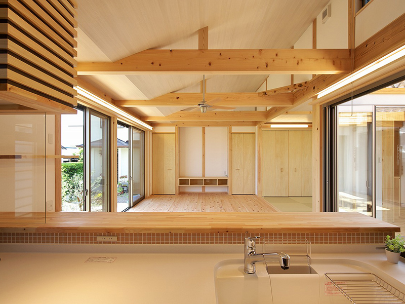 この建物は隣接地に親世帯があり敷地内通路を挟んで建築した。建物の中心には中庭が有り各部屋から中庭に出る事が出来る。中庭は土部分とウッドデッキを備え家族団らんの中心になる様又、来客が有る場合大勢で中庭を楽しめる様考慮した。LDKから中庭へは、開放的な開口部を設けリビングの一部としても活用出来る様配慮した、リビングからの眺望は田園風景を借景として憩いのスペースとなっている。寝室には小屋裏収納を設け書庫としているが、小屋裏に向けて吹き抜けの開放的な空間は部屋が広く感じられる。延べ面積は37坪であるが平屋建ての為合理的にプランが出来た、各部屋で表しにしている木材は施主の伯父の木材会社より厳選された木材が使われている。建築前敷地には、納屋やはなれなどいくつか古い建物が点在していたが、解体撤去、再構築し親世帯との繋がりが良くなり機能的な敷地となった。