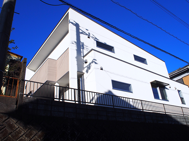 高台にある団地は東向きに広がる。敷地は80坪有り4台以上の駐車スペースを確保する要望があった。家族構成は3世代が住まう為玄関へのアプローチはスロープも設けた、玄関は内玄関も必要な為玄関収納を兼ねレイアウトし、玄関正面には中庭が見通せ、中庭を中心に回遊動線とした、玄関ホールからLDKに向かう動線はLDKと和室を一体で使える様接続している。LDKから中庭に出る窓は愛犬用、ダイニングに有るもう一つの引き戸は母の部屋に向かう動線で、回遊する廊下から中庭に出る事も出来る。又、母の部屋から東側の窓からの眺望も楽しめ反対側にある出入り口側の小窓は中庭を見通している。母の部屋から水回りへの動線は最小限に留める様考慮しユニバーサルデザインとした。2階の各部屋は階段に隣接した2階リビングを経て向かう、寝室はウォークインクローゼットと納戸を備えていて、バルコニーから眺望も楽しめる、子供の寝室はロフト付きで、もう一つの寝室は防音壁としている為映画も楽しめるように計画した。